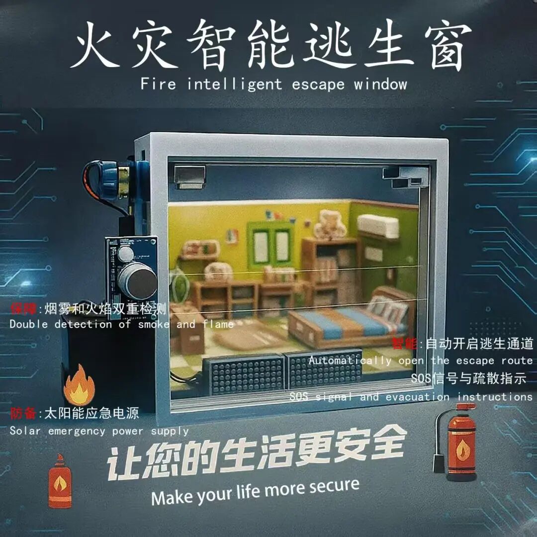 由24平面3班汪家印、24文秘4班陈柏林联合研制,具备双模火焰烟雾检测、自动启窗逃生、太阳能应急供电等系统,为高层建筑火灾应急疏散提供了可靠的技术解决方案。